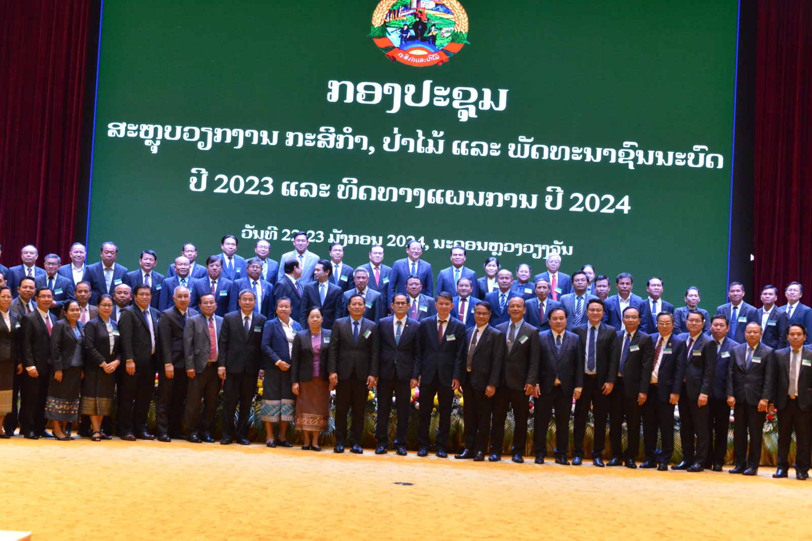 ກອງປະຊຸມວຽກງານກະສິກຳ ປ່າໄມ້ ແລະ ພັດທະນາຊົນນະບົດ ປະຈຳປີ 2023 ແລະ ທິດທາງແຜນການປະຈຳປີ 2024ໄດ້ອັດລົງດ້ວຍຜົນສຳເລັດ ພາຍຫຼັງດຳເນີນແຕ່ວັນທິ 22-23 ມັງກອນ 2024 ຢູ່ຫໍປະຊຸມແຫ່ງຊາດ ໂດຍການເປັນປະທານຂອງທ່ານ ເພັດ ພົມພິພັກ ລັດທະມົນຕີກະຊວງ ກະສິກຳ ແລະ ປ່າໄມ້ ໃຫ້ກຽດເຂົ້າຮ່ວມຂອງທ່ານ ສອນໄຊ ສີພັນດອນ ນາຍົກລັດຖະມົນຕີ ມີບັນດາຮອງລັດຖະມົນຕີ ຮອງເຈົ້າແຂວງ ພ້ອມດ້ວຍພາກສ່ວນກ່ຽວຂ້ອງທັງສູນກາງ ແລະ ທ້ອງຖິ່ນເຂົ້າຮ່ວມ