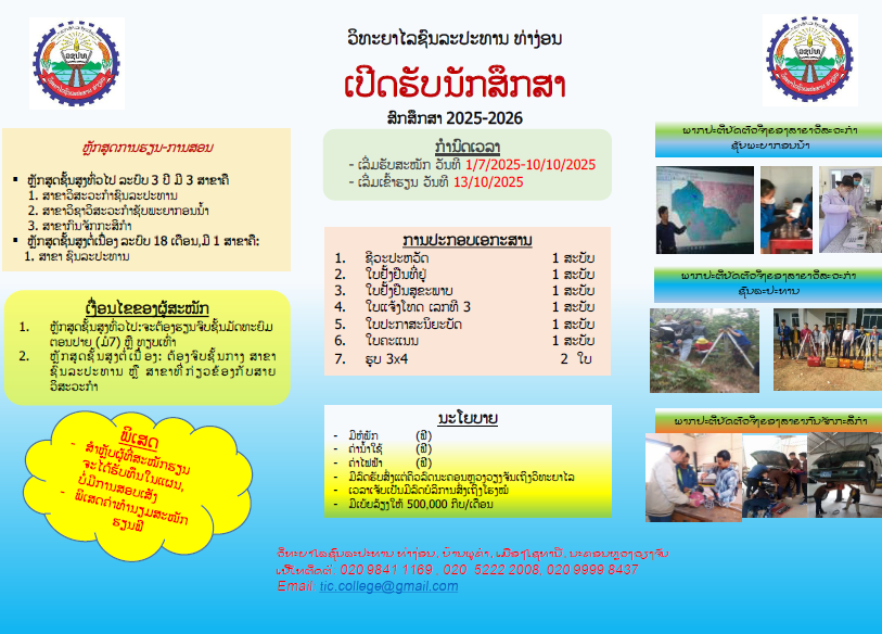 ວິທະຍາໄລຊົນລະປະທານທ່າງ່ອນ ປະກາດຮັບຄຳຮ້ອງເຂົ້າສຶກສາຕໍ່ວິຊາຊີບລະດັບຊັ້ນສູງຕໍ່ເນື່ອງສາຂາຊົນລະປະທານ, ຊັ້ນສູງທົ່ວໄປສາຂາວິສະວະກຳຊົນລະປະທານ, ວິສະວະກຳຊັບພະຍາກອນນ້ຳ ແລະ ສາຂາກົນຈັກກະສິກຳ ເລີ່ມແຕ່ວັນທີ 01/07/2025 ຫາວັນທີ 10/10/2025 ເລີ່ມຮຽນ13/10/2025.